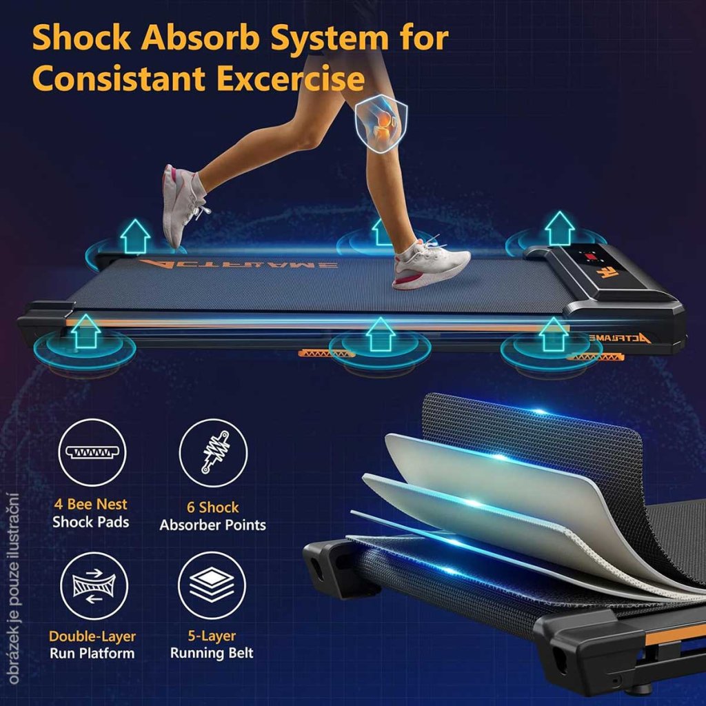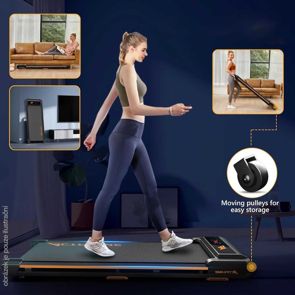 - Lehký a snadno přemístitelný - Přenosný běžecký pás má hmotnost 17,6 kg, což je méně než mnoho chodítek. To znamená, že chodící podložku můžete snadno přenášet. Díky hladkým kolečkům bude také pohodlnější.