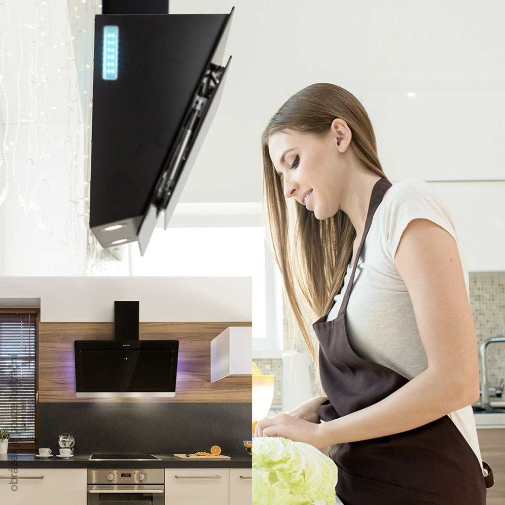 - Ergonomická: Komínová digestoř pro volný pohyb nad varnou deskou