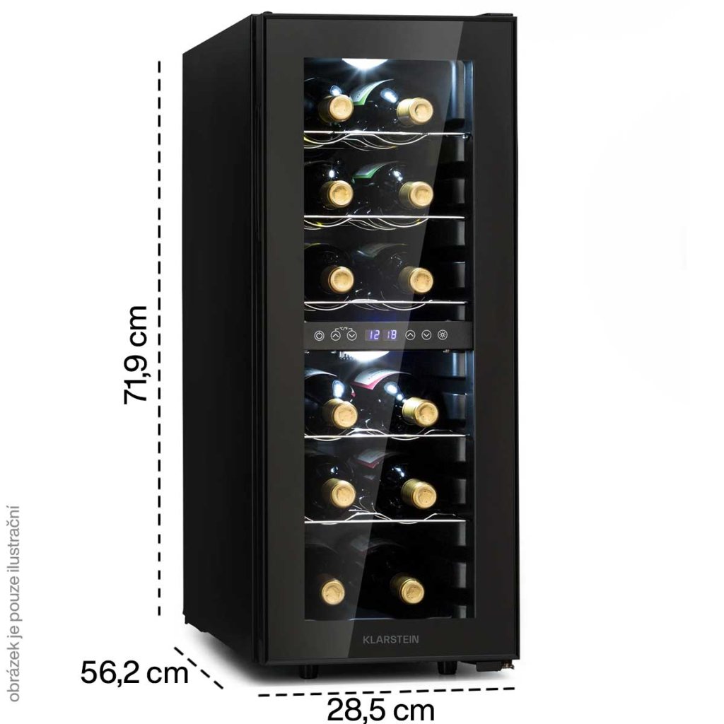- Kapacita (počet lahví): 12 (standardní lahve o objemu 0,75 l / výška 31 cm)