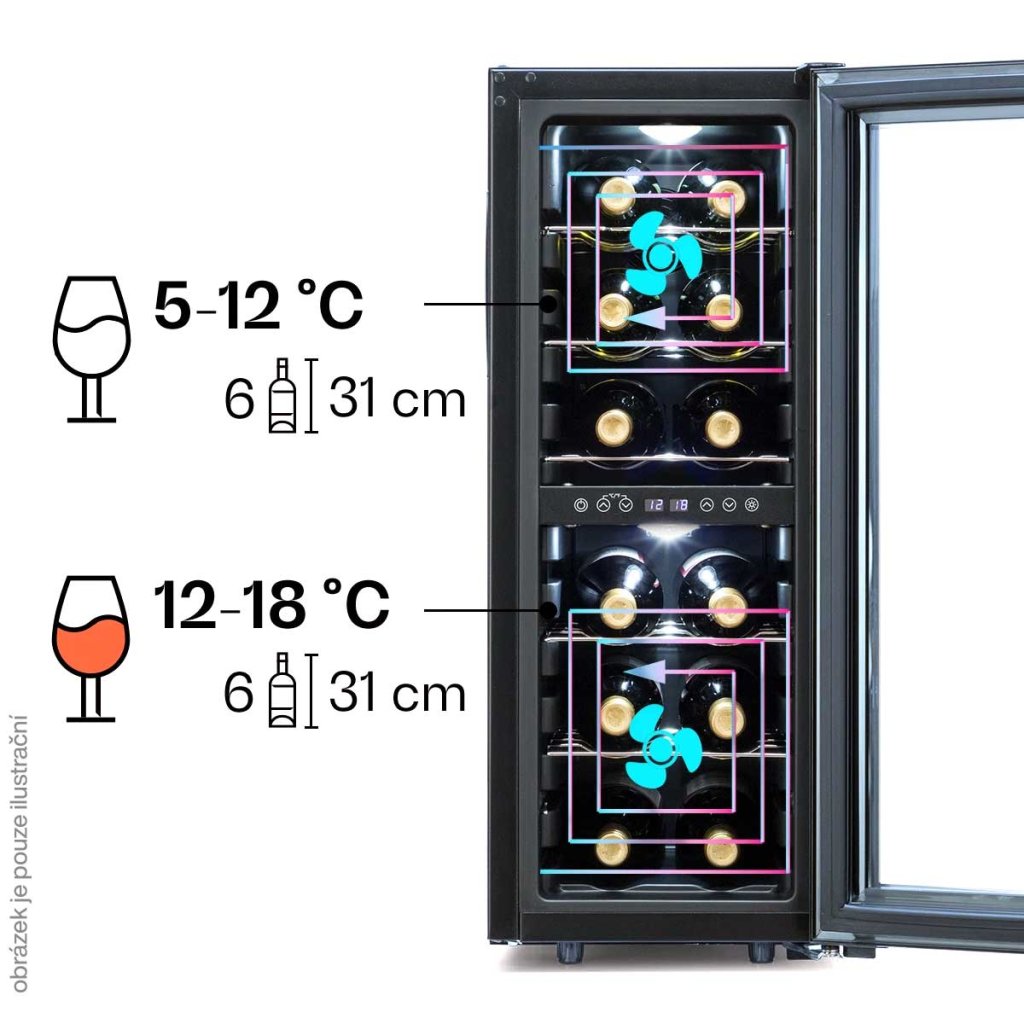 - Horní chladicí zóna: 5 až 12 °C (ideální pro bílá a růžová vína, šumivá vína, pivo nebo nealkoholické nápoje)