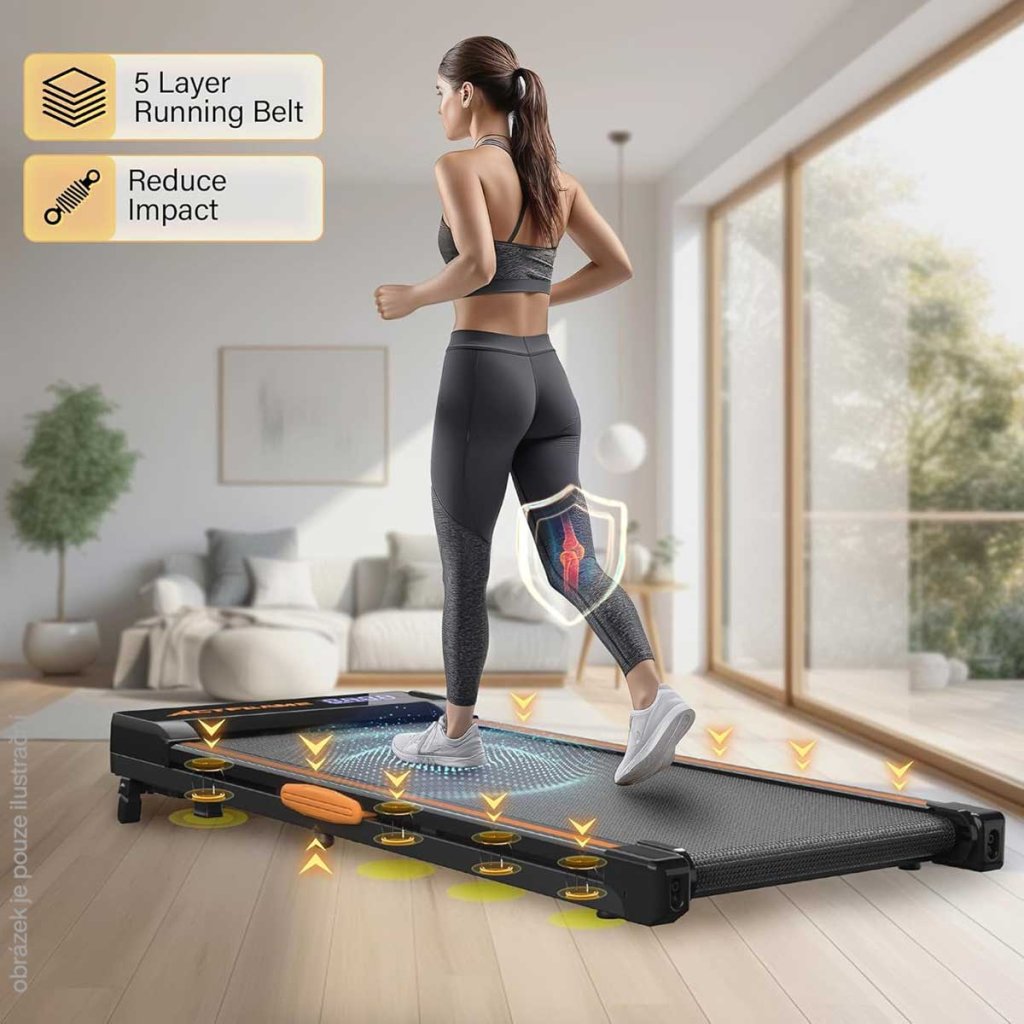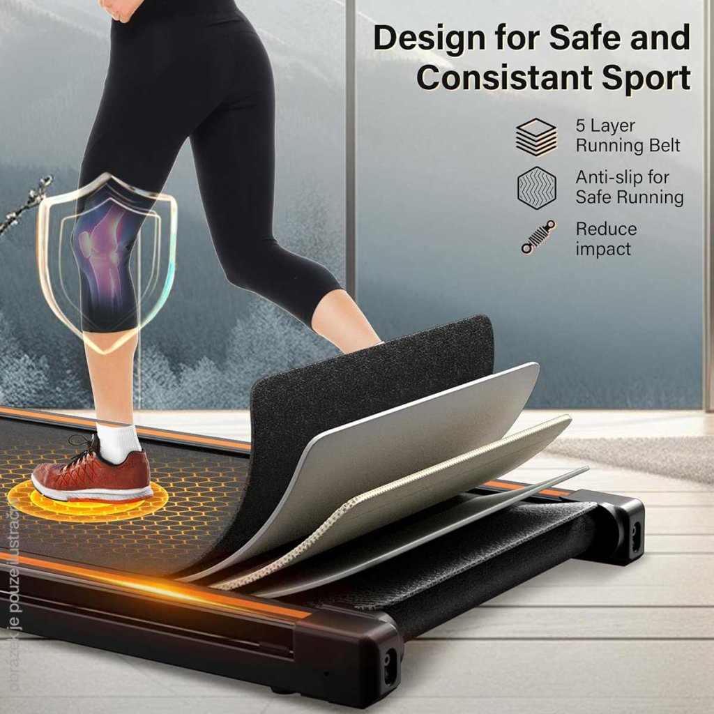 • 5vrstvý odolný protiskluzový pás: Náš chodník je vybaven 5vrstvým pásem, který zvyšuje bezpečnost uživatelů. Odolný, protiskluzový, snadno čistitelný a s menším nárazem na kolena, tento běžecký pás přináší pohodlný zážitek z cvičení. Zvyšuje také životnost běžeckého pásu.