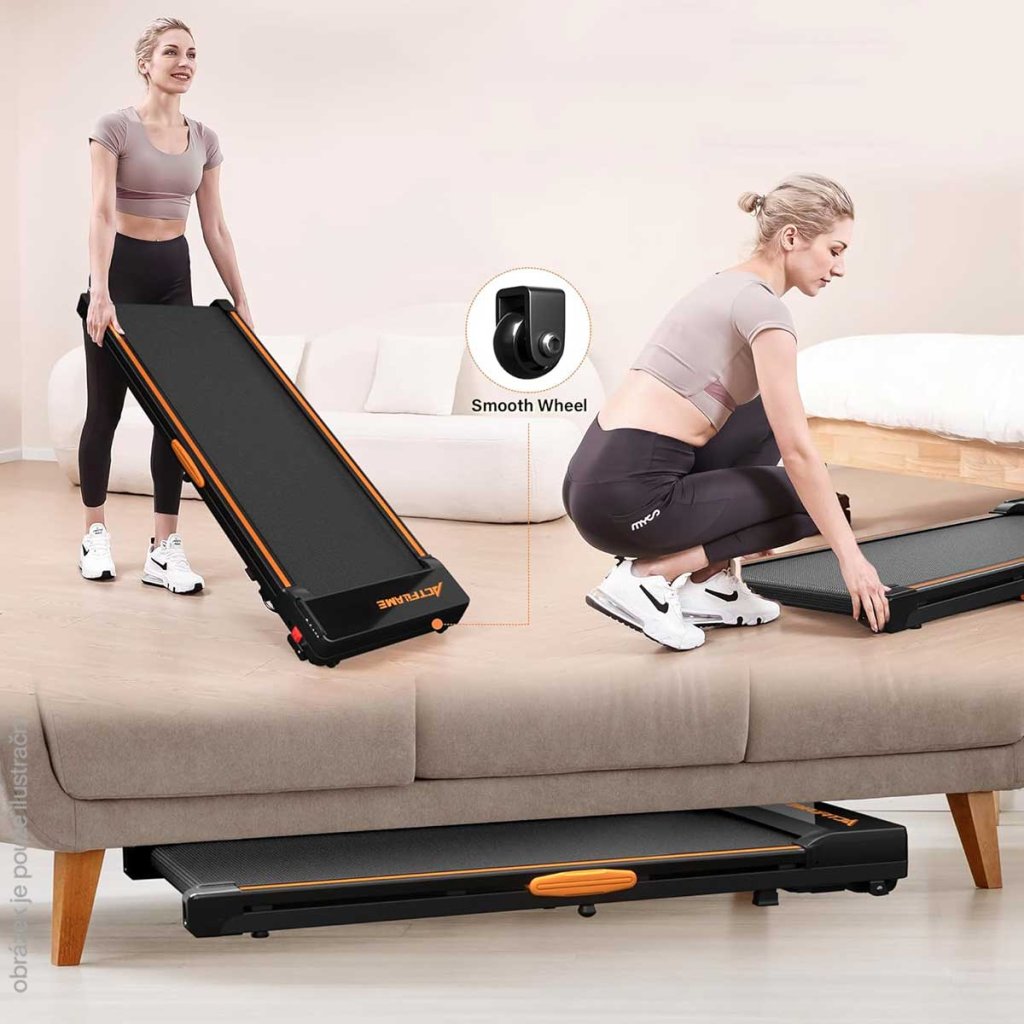 • Díky tloušťce 12,7 cm lze náš přenosný běžecký pás ACTFLAME snadno uložit pod pohovku nebo postel. Konstrukce vestavěných koleček umožňuje uživatelům snadné přemístění běžecké podložky. Přemisťování běžeckého pásu již není problém.